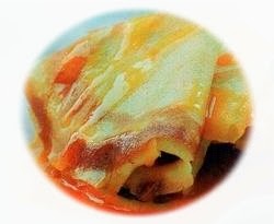 2. Panaskan pan dadar, olesi dengan margarin. Tuang 1 sendok sayur adonan, ratakan hingga terbentuk lapisan dadar tipis. Masak hingga matang. Lakukan hal yang sama hingga bahan habis.